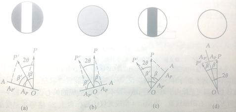 当通过检偏器观察半荫板视场时,可看到中间石英片部分与两侧视场的亮度一般是不相同的(常称为三分视场),如下图。